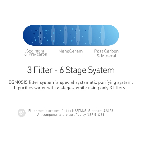 Every Osmosis Water purifiers equipped with 3 filters which can remove virus, heavy metals, Escherichia Coil, Staphylococcus aureus,, Super Bacteria, Pseudomonas aeruginosa, Salmonella, Shigella. All filter media are certified by NSF which compliance to standard 42 and 53 , and all the wet parts are certified by NSF 51 and 61. For more details of filters , please click